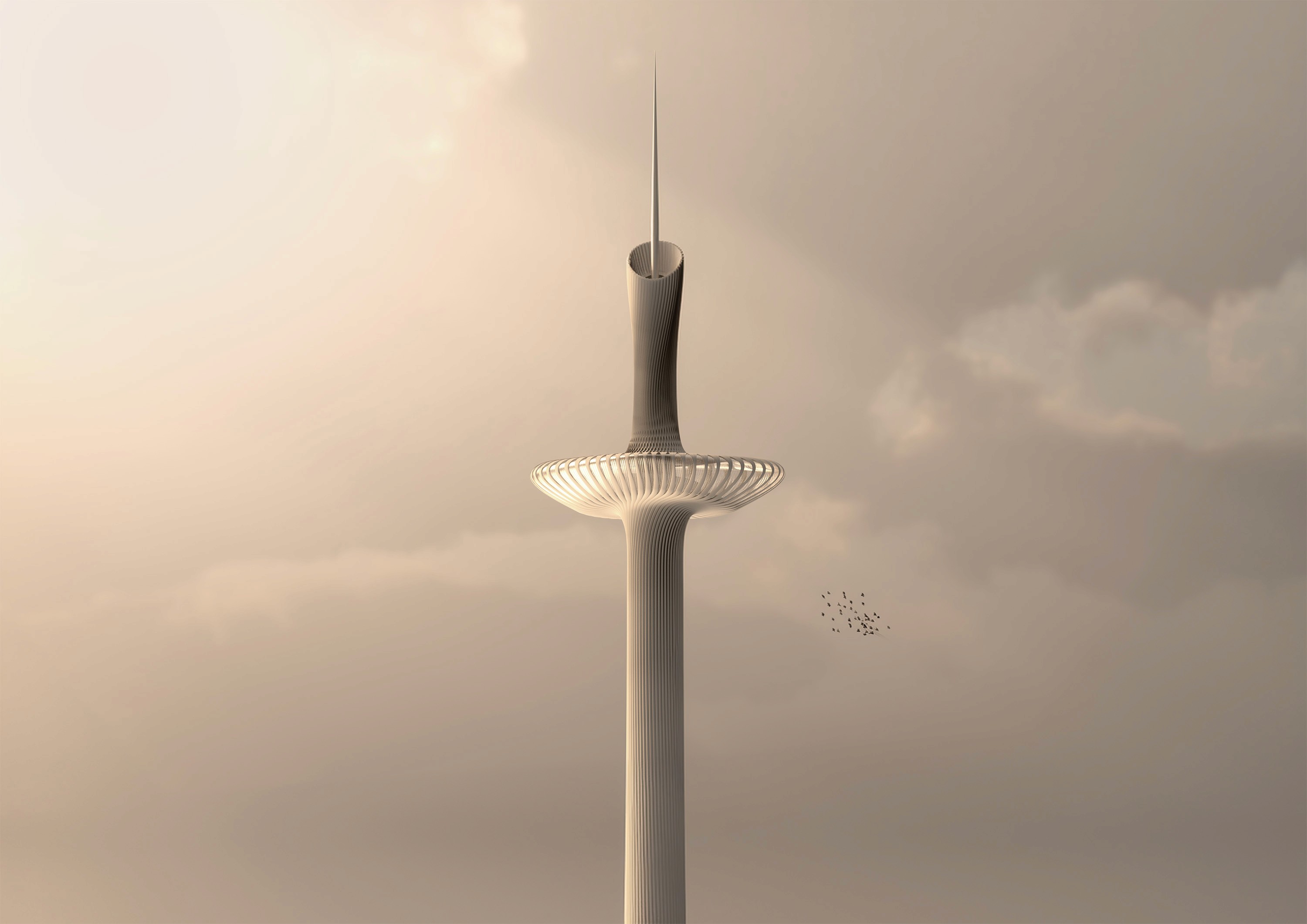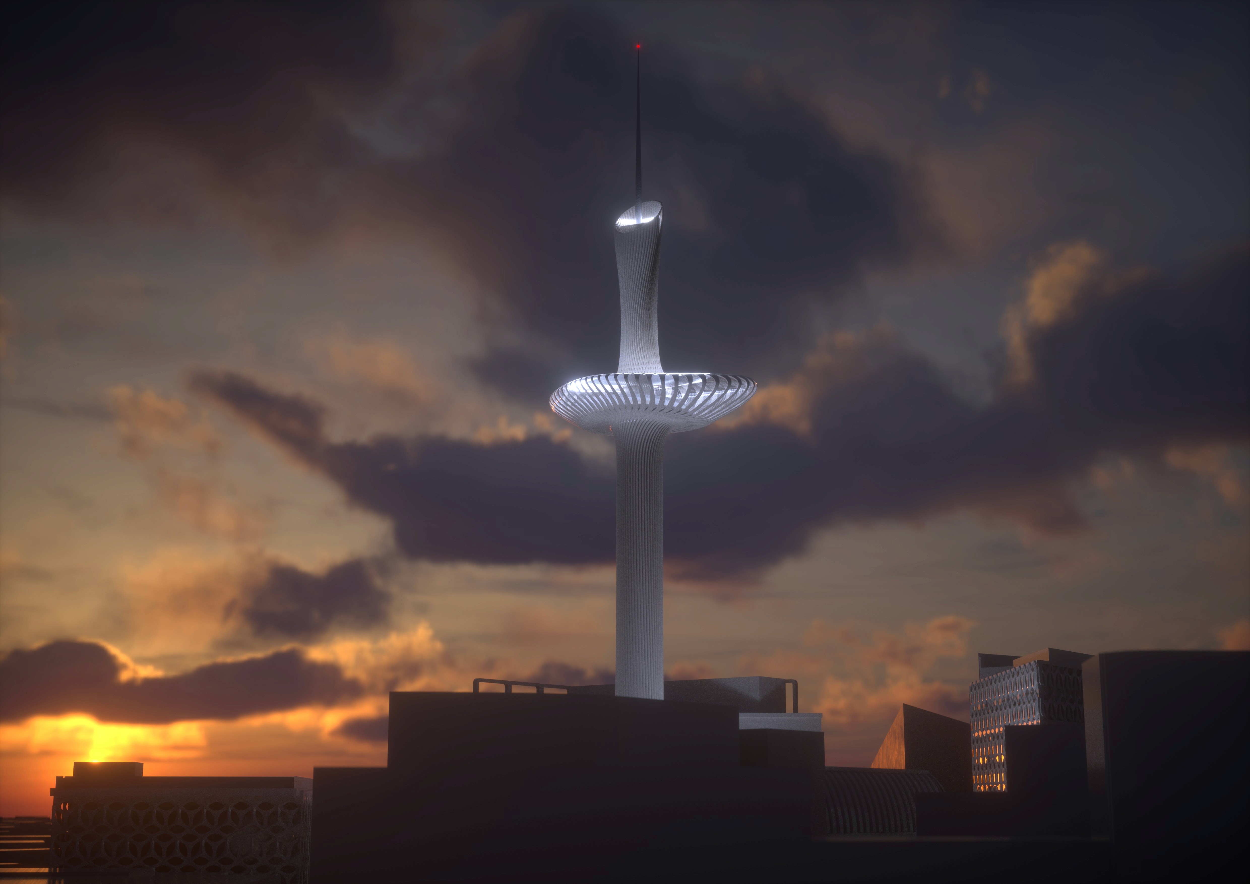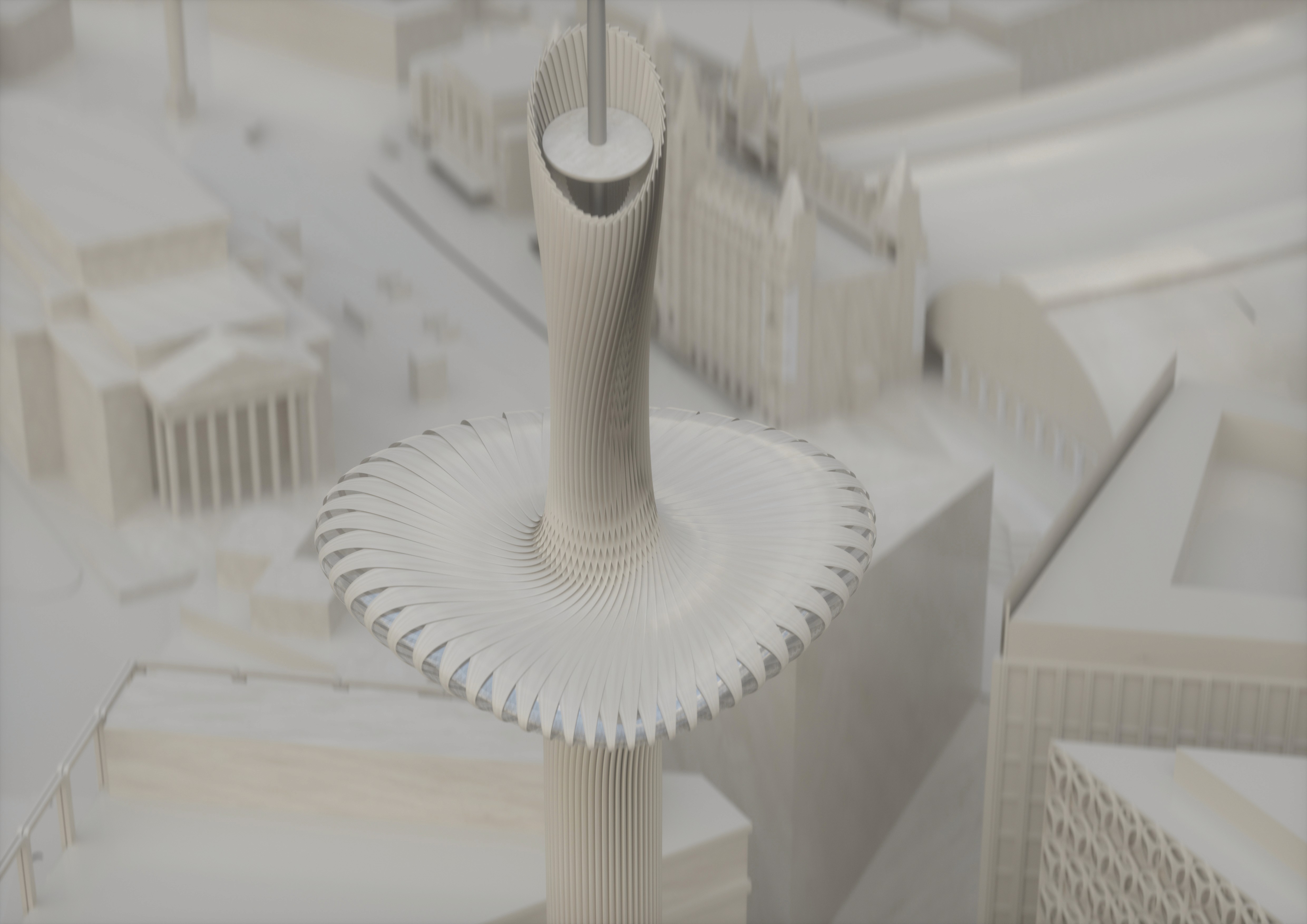 The proposal retains the existing tower but introduces a new sculptural architectural skin that wraps around the original structure. This intervention both celebrates and reinforces the tower’s vertical form. The ribbed outer structure acts as a new exoskeleton that visually extends the tower while also helping to stabilise and strengthen the original shaft. Rather than replacing the historic structure, the design builds upon it, transforming the tower into a more expressive and resilient piece of architecture.