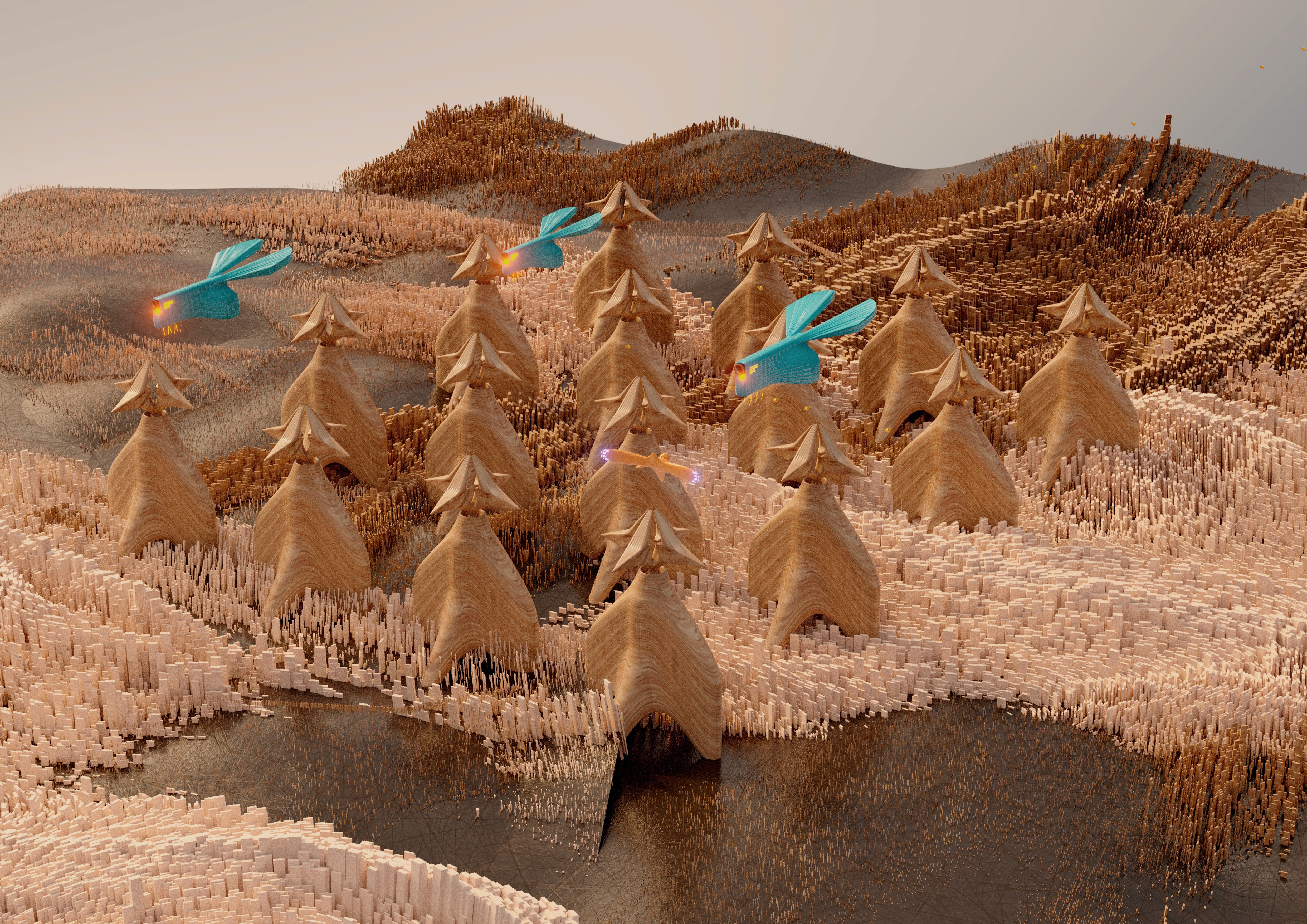 The tower forms came afterwards, almost as a response to the terrain. I didn’t want hard edges or sharp industrial language. I wanted structures that felt carved, coaxed, or grown out of the same wooden logic as the landscape. Continuous surfaces. Soft tapering. Entrances that feel hollowed rather than constructed.
