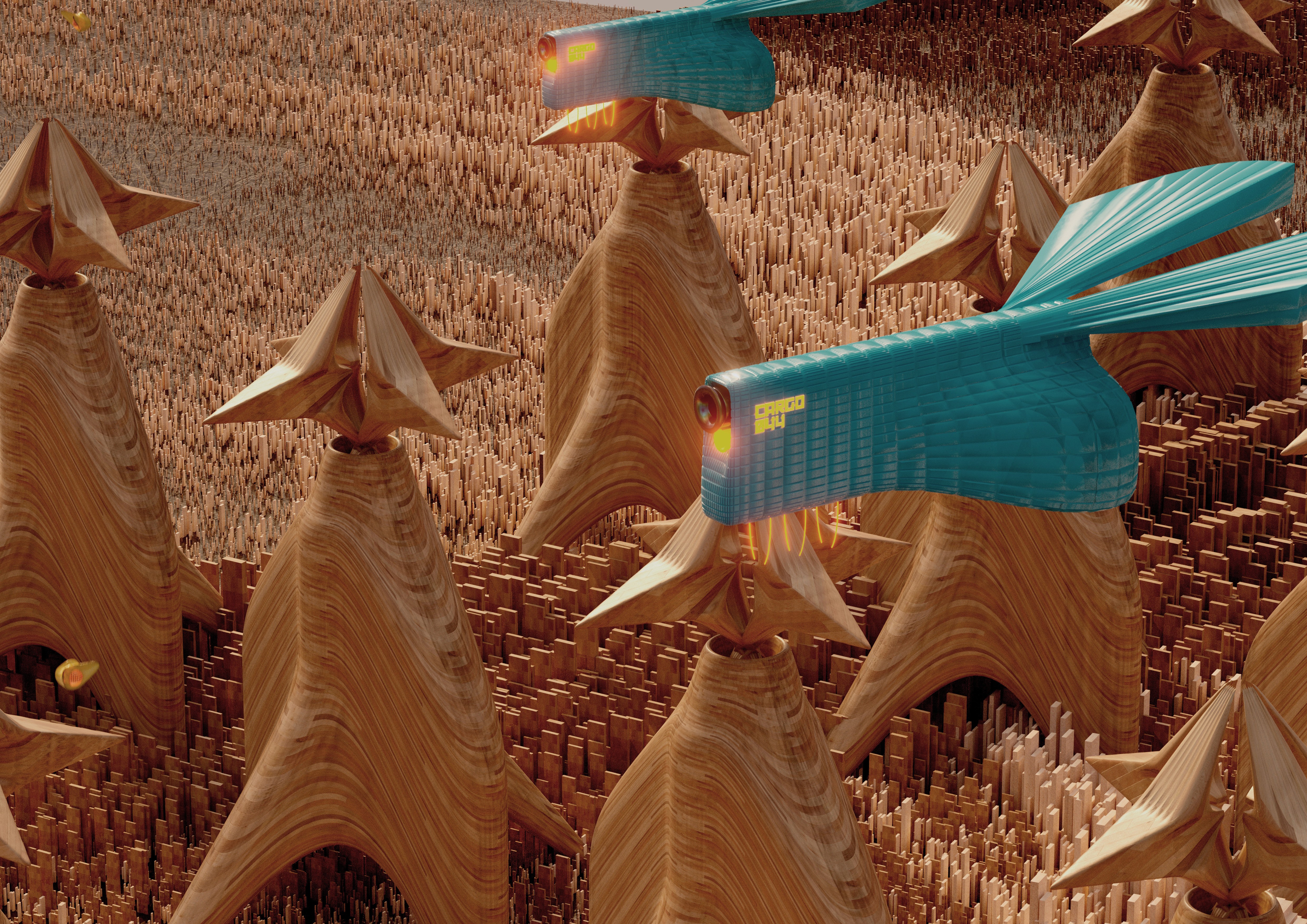 Inside Cinema 4D, I started experimenting with Octane Scatter, pushing repetition further than I normally would. Thousands of vertical extrusions, clustered and distributed across a landscape until the ground stopped feeling like ground. It began to look like growth. Like erosion. Like something halfway between mineral formation and tall grass.